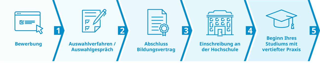 Wenn Sie sich für das Studium mit vertiefter Praxis in einem Studiengang mit IT-Ausrichtung interessieren, dann können Sie sich ganz einfach bei einer der Verwaltungen als Ihrem möglichen Praxispartner bewerben. Bitte entnehmen Sie die Einzelheiten den Ausführungen weiter unten. Ihr Bewerbungs- und Einstellungsprozess könnte dann so aussehen:
