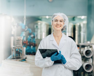 Bild einer Frau in einem Laborkittel, welche ein Tablet in der Hand hält.